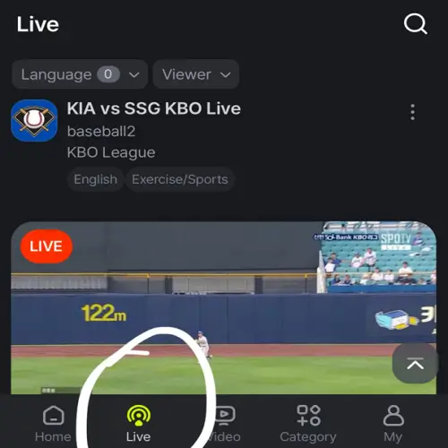 • 'Live' 메뉴를 선택하고 프로야구 생중계를 시청합니다.